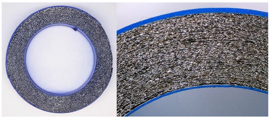 NC is a magnetic material which is being increasingly used in other types of applications where low frequency electromagnetic noise can become a problem, such as energy storage, current sensors or electronic filters []. The main advantage of NC material is because of the material’s intrinsic properties it can be used to design more reduced components with better magnetic properties for low frequency applications. NC cable ferrite, as opposed to MnZn and NiZn, is not a solid core since it is formed by a rolled up about 20 µm metal film. Figure 1 shows the cross section of the NC core in which it is possible to observe the metal film and the coated material used to press and protect it. The external coated layer is very important due to the metal film being very brittle, thus, any breaking could generate discontinuities in the material and deteriorate its performance. Consequently, one limitation of this material is its ability to manufacture different core shapes because the metal film cannot be cut and it is not possible to manufacture air gap or snap cores.