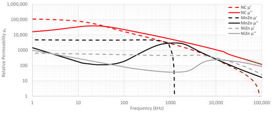 Figure 3 represents the relative permeability traces of NC, MnZn and NiZn cable ferrite compositions split into real and imaginary components. Frequency resonance is an important value in this graph as it is the point where real and imaginary parts crosses and, thus, the material changes its dominant behavior. The values represented in this graph have been measured with specific and calibrated equipment by following two setups depending on the frequency range selected. From 1 MHz to 100 MHz, the complex relative permeability has been obtained with a E4991A Material Analyzer equipment (Keysight, Santa Rosa, CA, USA) together with its 16454A Magnetic Material Text Fixture. The 16454A makes it possible to carry out accurate permeability measurements of round-shaped magnetic materials due to the construction of this fixture creating one turn around the core without magnetic flux leakage. Thereby, it is possible to obtain complex permeability direct readouts of complex permeability. This equipment does not allow us to measure permeability from 1 kHz to 1 MHz, so a second method is employed in which relative permeability of magnetic material is obtained from the self-inductance of a round-core that has a closed loop. This second setup provides the value of effective permeability derived from the inductance measurement results by using Equations (1) and (2). This procedure is carried out with a E5061B Vector Network Analyzer (Keysight, Santa Rosa, CA, USA) together with a Terminal Adapter 16201A (Keysight, Santa Rosa, CA, USA) and the Spring Clip Fixture 16092A (Keysight, Santa Rosa, CA, USA) by rolling three turns in the cable ferrite component in order to evaluate the inductance with respect to the ends of the wire [].