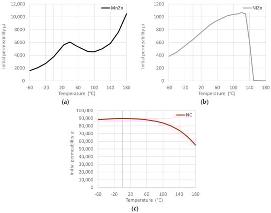 Initial permeability versus temperature for three different cable ferrites: (a) MnZn; (b) NiZn; (c) NC.