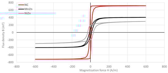 Hysteresis curve measured for NC, MnZn and NiZn cable ferrites.