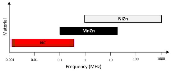 The behavior of these parameters depends on the material internal composition and it is usually represented versus the frequency. One way of knowing the performance of the three different cable ferrites materials mentioned above, is through examining the permeability parameter. Ceramic materials are defined by a high saturation and a permeability between 100 and 15,000 depending on its internal characteristics []. In the case of the MnZn cable ferrite, it represents a very important soft magnetic material because of its high initial magnetic permeability, saturation magnetization, electrical resistivity and low power losses []. Likewise, its practical range of frequencies is the medium frequency range that is going from some tens of kHz to a few MHz []. With regard to NiZn ferrites, they are one of the most versatile soft magnetic materials, especially suitable for high-frequency applications due to their high magnetic permeability from tens of MHz to hundreds of MHz and its larger cut-off frequency compared to another composition like MnZn []. In terms of composition, both ceramic materials are mostly based on iron oxide (Fe2O3) with a proportion of about 70%. In this way, NiZn cable ferrite contains a higher amount of Zn to improve the cut-off frequency with the aim of attenuate electromagnetic noise at higher frequencies [,]. Furthermore, Cu is introduced in the NiZn composition in order to reduce the firing temperature to ease the manufacturing process as well as improve electromagnetic properties at high frequencies []. On the other hand, NC presents a much higher initial permeability than ceramic materials because it has been annealed and subjected to a magnetization process. This improvement of magnetic properties produces a very significant increase in the permeability, reaching values about 100,000 [].
