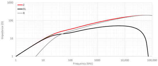 One of the most common methods used to characterize a cable ferrite is based on measuring its impedance. The impedance of a cable ferrite can be separated into two components. When this EMC component is used to suppress electromagnetic noise, the loss resistance (R), which represents the losses, needs to be taken into account. Figure 7 illustrates the contribution of loss resistance as well as inductance (XL) to the magnitude of the impedance of the NC cable ferrite analyzed in this research. The parameters plotted on this graph have been measured through carrying out the inductance measurement method, but in this case, only one turn is rolled in the component []. Thereby, it can be observed in Figure 7 how the inductance is stable in a certain frequency range and show strong frequency range dependence above around 10 kHz. Above 30 MHz the inductance falls sharply, down to zero at around 80 MHz. The loss component (R) grows continuously with frequency and reaches the same value as the XL component at the ferromagnetic resonance frequency. The resistance value rises until MHz range and dominates over the magnitude impedance (ZF). Therefore, in this cable ferrite, the absorption part is dominant and the ability to reduce the electromagnetic noise is greater because of the ferromagnetic resonance frequency. This behavior can also be observed in Figure 3 where complex permeability of three materials is represented.