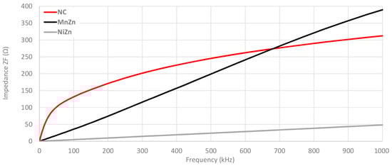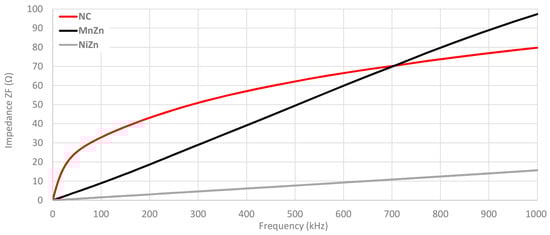 As it has been described in Section 2.2, theoretical insertion loss parameter is calculated from the magnitude of the impedance. Figure 10 shows that the impedance of NC cable ferrite is higher than MnZn and NiZn components until 700 kHz. From this frequency, MnZn cable ferrite provides a greater performance, although its initial magnitude impedance is lower, the angle of slope of its trace is higher than NC. With regard to NiZn cable ferrite trace, it can be observed how its impedance is much lower if this is compared with NC and MnZn materials because it is destined to a higher frequency range.