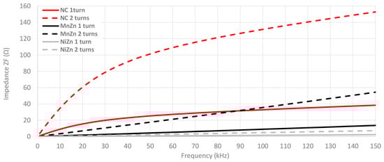 A zoom in on 2–150 kHz frequency range is performed as shown in Figure 12 in order to analyze in detail the impedance provided for each cable ferrite when one and two turns are wound. This graph demonstrates the huge difference among the impedance provided by NC cable ferrite and the others. If 100 kHz is taken as a reference, NC provides 24.0 Ω more than MnZn and 31.6 Ω than NiZn cable ferrites with one turn. Considering two turns, NC impedance is 96.1 Ω higher than MnZn and 127.7 Ω. It can be also observed that NC with one turn is even higher than MnZn with two turns until 88 kHz.