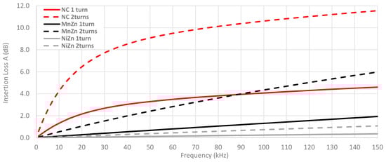 Once the magnitude impedance has been analyzed, the insertion loss parameter is calculated through Equation (4) from ZF measured of each cable ferrite, ZA = 50 Ω and ZB = 5 Ω. Figure 13 shows the calculated or theoretical insertion loss parameter of the three cable ferrites with one and two turns of cable are wound. As illustrated in Figure 13, NC is again the composition that provides the best performance to attenuate the electromagnetic noise until 150 kHz. Moreover, all insertion loss traces are proportional to the magnitude impedance represented above. Taking 100 kHz as a reference point, NC attenuates 2.8 dB more than MnZn and 3.8 dB than NiZn cable ferrites with one turn. In the case of two turns, NC attenuation is 6.3 dB higher than MnZn and 9.9 dB than NiZn cable ferrites.