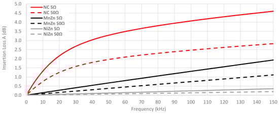 Another factor to consider is the performance of cable ferrites in systems with different impedance and, thus, it could be interesting to study the insertion loss parameter by including several values of ZA and/or ZB in Equation (4). Consequently, Figure 14 shows a comparison among the insertion loss parameter calculated from ZF measured of each cable ferrite with one turn, setting ZA = 50 Ω and ZB = 5 Ω or ZB = 50 Ω. This chart illustrates how, the higher the system output impedance in which the cable ferrite is included, the lower the insertion loss that is able to provide the cable ferrite. At the 100 kHz frequency point, there is a difference of 1.6 dB between the NC traces with 5 Ω and 50 Ω, 0.5 dB in the case of MnZn traces and 0.2 dB for NiZn traces.
