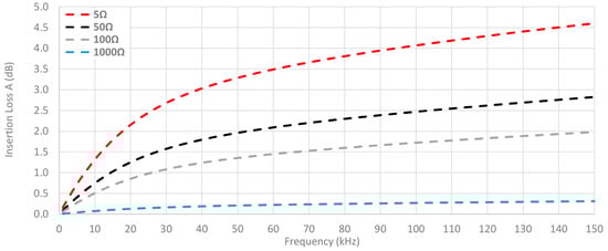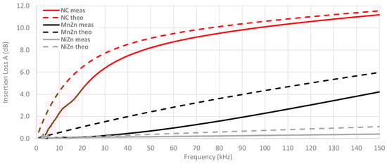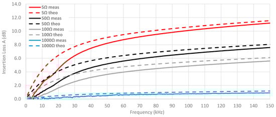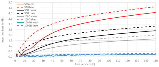 Figure 20 shows the same comparison as Figure 19, but in this case, two turns are wound in the NC cable ferrite. Therefore, the difference between measured and theoretical insertion loss is reduced regardless of the system impedance. Moreover, it can be observed that the higher the frequency, the lower the difference between theoretical and experimental insertion loss.