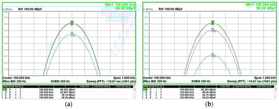 The experimental insertion loss is measured by following the procedure explained in Section 2.3. Figure 16 shows an example of the measurement method used to determine the insertion loss parameter with one turn (a) and two turns (b). Experimental insertion loss is determined by subtracting to the trace 1 (yellow), which represents the reference before placing any cable ferrite in the system, one of the other three traces. Trace 2 (blue) represents the signal measured after placing the NC cable ferrite, trace 3 (purple) corresponds to MnZn and trace 4 (blue) is acquired when the NiZn cable ferrite is placed. Therefore, the insertion loss of NC cable ferrite at 100 kHz is given by subtracting markers 1 and 2 represented in the table below the spectrum in (a) in the case of one turn and (b) in the case of two turns. As a result of this step, the insertion loss obtained for the NC cable ferrite is 3.486 dB with one turn and 9.993 dB when the cable ferrite is wound with two turns. Consequently, by extrapolating this method to the whole frequency range of 2–150 kHz it is possible to obtain the performance of each material in terms of attenuation ratio.