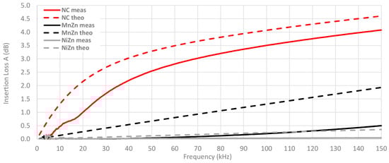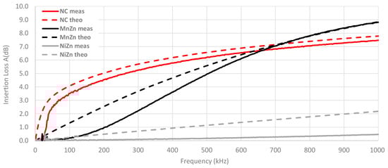 A comparison between the theoretical insertion loss and the insertion loss measured with the three material cable ferrites with one turn wound is shown in Figure 17. The measured value of NC cable ferrite is 1.2 dB lower than the theoretical NC trace at 20 kHz, although, at 100 kHz this difference is reduced up to 0.6 dB. Nevertheless, in the case of MnZn and NiZn, the higher the frequency, the higher the difference between theoretical and experimental insertion loss. Hence, the NC traces trend is very similar but the theoretical and experimental traces of MnZn and NiZn do not follow the same trend.