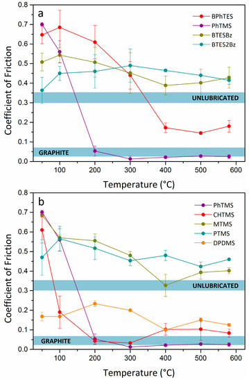 The following are available online at http://www.mdpi.com/1996-1944/11/2/180/s1, Figure S1: Schematic representation of the pin-on-disc setup and the shape of the pin, Figure S2: Variation of the average CoF with temperature of graphite and unlubricated surfaces, Figure S3: SEM images of PhTMS and CHTMS powders, Figure S4: CoF versus temperature of PhTMS samples with different grain sizes, Figure S5: DSC graphs of PhTMS and CHTMS, Temperature-dependent DRIFTS data of BPhTES, BTESBz, and BTES2Bz, Figure S6: Temperature-dependent DRIFTS spectra of PhTMS-derived material with three successive temperature cycles, Figure S7: Temperature-dependent DRIFTS spectra of PhTMS-derived material with three successive temperature cycles, Table S1: Peak list and assignations of temperature-dependent DRIFTS spectra in Figure 3.