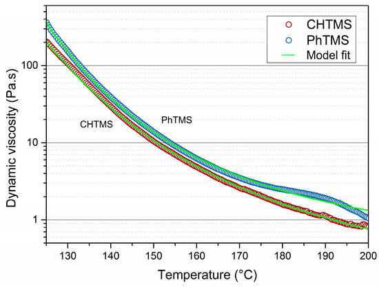 The two organosilicas with lowest CoF at high temperature, i.e., PhTMS and CHTMS-derived powders, were subjected to dynamic mechanical analysis. Data are shown in Figure 2. They display the change in dynamic viscosity upon heating to 200 °C. The viscosity decreases with increasing temperature as the result of reduced friction between molecules, arising from reduced intermolecular interactions with increasing molecular free volume. It can be seen that the dynamic viscosity for both networks decreased by at least two orders of magnitude in this temperature interval. The changes are gradual, and no clear transitions can be seen in the Differential Scanning Calorimetry (DSC) data in Figure S5, in the supporting information. The lowest recorded viscosities were 0.7 Pa∙s for CHTMS, and 1.0 Pa∙s for PhTMS at 200 °C. The Masuko-Magill model was fitted to the experimental viscosity data [24]