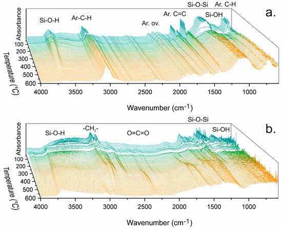 The most remarkable change in the spectra of PhTMS-derived material (Figure 3a) is the sudden intensity drop of all absorption peaks around the temperature region where softening was recorded by PoD. The intensity decay started at 105 °C until partial recovery at 145 °C and was attributed to the formation of a less IR-active state upon thermal relaxation and/or melting of the network. The absorbance changes indicate the formation of an intermediate state involving flow of material that may or may not involve chemical changes, i.e., bond breakage and reformation [29]. Solid-state silicon nuclear magnetic resonance studies have shown that PhTMS-derived material can have relatively high concentrations of silanol groups, but also that the network may undergo ongoing condensation 2 Si–OH → Si–O–Si + H2O with increasing temperature [10]. This suggests ongoing organization of the three-dimensional organosilica network in the flowing state and increasing condensation of the silanol groups upon further heating [29]. Indeed, the DRIFTS spectra in Figure 3a indicate ongoing condensation with increasing temperature, evidenced by the decay of hydroxyl vibrations at 3600–3200 cm−1 and silanol vibrations around 900 cm−1. The progressive condensation of silanol groups into siloxane bonds was found to be an irreversible process, as demonstrated in Figure S7 in the supporting information, and in agreement with the hardening observed for PhTMS during the CoF measurements as discussed above. The degree of condensation is directly coupled to the disappearance of viscous reflow properties in PhTMS-derived powders. Overall, PhTMS networks were found to be thermochemically stable against oxidation up to 600 °C in air under the conditions of our measurements.