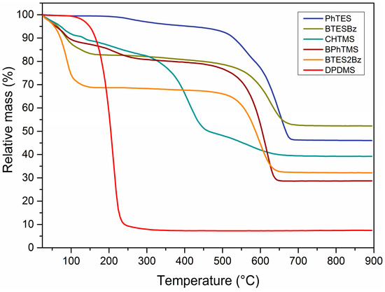 Thermal evolution of different organosilica materials. Thermogravimetric analysis (TGA) of materials derived from PhTMS, BPhTES, CHTMS, BTESBz, BTES2Bz and DPDMS in flowing air. Heating rate of 5 °C/min.