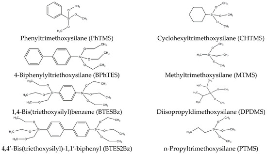 Organosilica materials are silicon oxide networks that contain organic groups distributed at the molecular level, i.e., a fraction of the Si–O bonds is replaced by Si–R bonds (R is alkyl, alkylene, phenyl, phenylene, etc.). The mixed organic-inorganic nature of these materials provides an interesting combination of material properties, such as the high thermal and chemical stability of silica and the hydrothermal stability and flexibility of the organic groups [1,2]. The position of the organic groups can be terminal (Si–R) or bridging (Si–R’–Si), which affects their exposure at the (internal) surface and influences the crosslink density and microporosity of the network [3]. Organosilicas can be prepared by mild and versatile sol-gel routes and applications are, for instance, molecular separation membranes [4], catalysts [5], low-k materials [6,7] and sensors [8]. Organosilica networks offer the combined advantage of a mechanically strong yet flexible network. The rigidity and strength of silica networks composed of connected silicate SiO4 units is supplemented by the flexibility and elasticity provided by organic segments. For example, the introduction of ethylene bridges between silicon atoms improves the fracture resistance of the material [6]; it maintains a high Young’s modulus at high porosity [6] and its flexibility allows fabrication of films with a thickness over 1 µm without crack formation during drying [9]. The addition of organics also has an influence on the thermal properties. There are reports in the literature showing the influence of certain organic moieties on the glass transition (Tg) and the melting temperature (Tm). For example, the use of bulky arene-terminal siloxane precursors, such as phenyltrimethoxysilane (PhTMS) yields a material with decreased Tg and Tm compared to silica. The incorporation of the bulky phenyl group results in glassy behavior upon heating, allowing re-melting of the polymer at low temperatures (<100 °C) compared to materials based on smaller monomers, such as networks derived from methyltrimethoxysilane (MTMS) [10]. Some examples of organically modified silane precursors are shown in Scheme 1.