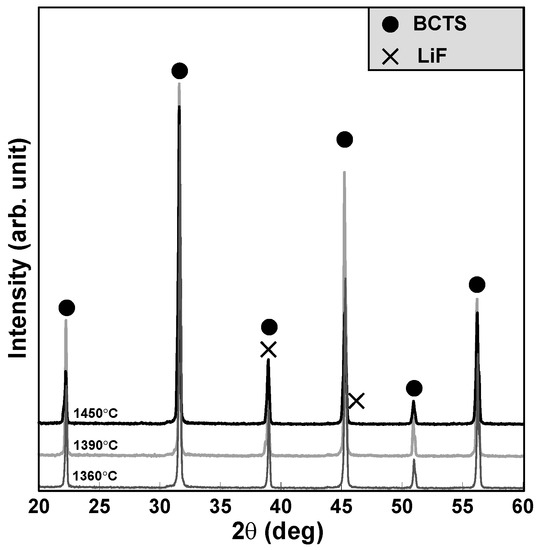 Figure 1 shows the XRD patterns (2θ = 20–60°) of the (Ba0.95Ca0.05)(Ti0.93Sn0.07)O3—0.07 wt % LiF ceramics sintered at 1360, 1390 and 1450 °C for 2 h. It can be seen that all of them reveal a pure perovskite structure, and owing to its small amounts and added after calcined process, the peaks of LiF are not obvious and overlaps near 2θ = 40°. The SEM images of the pure BCTS (y = 0) sheets (sintered at 1420, 1450 and 1480 °C for 2 h) are shown in Figure 2a–c, and the SEM images of the BCTS–0.07LiF sheets (sintered at 1360, 1390, 1420 and 1450 °C for 2 h) are also shown in Figure 2d-g, respectively. After comparing these seven figures, we observed that, pure BCTS sheets revealed dense and better grains growth at about 1450 °C. However, for the BCTS–0.07LiF sheets, 1450 °C is already too high for sintering, and a melted surface can be observed (as Figure 2g shown). This means that owing to the addition of 0.07 wt % LiF, the optimum sintering temperature of the BCTS sheets has been lowered from 1450 °C to only 1390 °C. Furthermore, comparing these two sheets with same sintering temperatures of 1420 °C (Figure 2a,f), it can be observed that 1420 °C is too low for pure BCTS (much more pores and small grains), but that for BCTS–0.07LiF, it is too high (very large grains). Thus, LiF will enter a liquid phase (melting point = 848 °C) at the sintering temperature, and it readily plays the role of the sintering promoter.