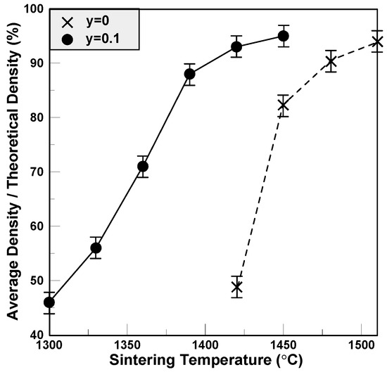 For BCTS ceramics, the lattice constant and theoretical density measured from the XRD patterns shown in Figure 1 are 4.003 Å and 6.04 g/cm3, respectively, and the percentages of the measured average densities are shown in Figure 3. It can be seen that for pure BCTS ceramic sheets (y = 0), as the sintering temperature increases, the average density increases, saturates gradually, and equals 93% of the theoretical density at about 1510 °C. However, for the BCTS–0.1LiF sheets, as the sintering temperature increases, the average density increases, and saturates gradually and equals 94% of the theoretical density at only about 1390 °C. This phenomenon means that the LiF was already a good sintering promoter for the BCTS ceramics, which can dense the sheets as well as low down its sintering temperature. However, for obtaining better flexibility of the sheets, more polyvinyl alcohol (PVA) binder were used, and hence, the average density of the sheets was usually smaller than that of the normal specimen.