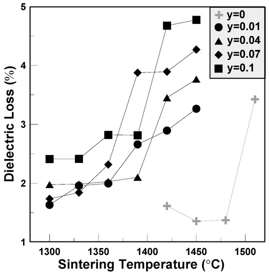 The dielectric loss variations of the BCTS–yLiF sheets are shown in Figure 5. For pure BCTS, as the sintering temperature increases, it first decreases to a minimum value, and then increases to about 3.4% for 1510 °C. The optimum dielectric loss is about 1.3%, which happened at 1450 °C. However, for all of the other BCTS–yLiF sheets, the dielectric loss increases as the sintering temperature increase. Compared with pure BCTS sheets, the BCTS–yLiF sheets reveal larger dielectric constants; however, this is accompanied by a higher dielectric loss. This means that too many LiF dopants are not suitable, and will cause an increase of dielectric loss.