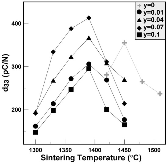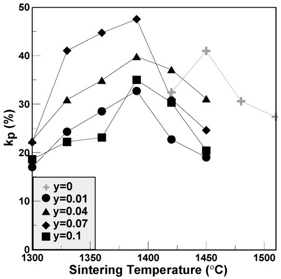 The variations of piezoelectric constants and electromechanical coupling factors of the BCTS–yLiF sheets are plotted in Figure 6 and Figure 7, respectively. It is clear that for all of the specimens, the d33 values first increase and reach a maximum value, and then decrease gradually. The maximum d33 value of BCTS–0.07LiF is 413 pC/N, and its sintering temperature is only 1390 °C. However, for pure BCTS, the maximum d33 value is only 355 pC/N, and sintered at 1450 °C. Hence, it obviously can be found that, owing to the addition of the LiF liquid-phase sintering promoters, the optimal sintering temperature of the BCTS sheets can be reduced significantly about 60 °C, but also piezoelectric characteristics improved. Furthermore, for the electromechanical coupling factors of the BCTS–yLiF sheets, as the sintering temperature increased from 1300 °C to 1450 °C, all of the the kp values revealed the similar trend of d33 values. Except for the pure BCTS specimens (which happened at 1450 °C), all of the maximum kp values happened at 1390 °C. For the pure BCTS specimens, the maximum kp value is 0.40, and sintered at 1450 °C; however, for the BCTS–0.07LiF specimens, the maximum kp value is 0.48, and sintered at only 1390 °C.