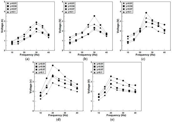 The peak voltage of the BCTS–yLiF sheets for different vibration frequencies. (a) Tip mass = 0 g; (b) Tip mass = 0.5 g; (c) Tip mass = 1.0 g; (d) Tip mass = 1.5 g; (e) Tip mass = 2.0 g.