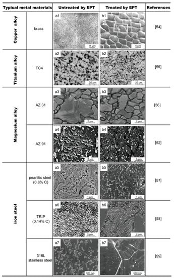 EPT has been applied to many metals and alloys to achieve ultrafine-grained microstructure and nanostructures that arise from the solid state phase transitions and the process of recovery and recrystallization during their treatment. Figure 1 shows the variation in microstructures of copper alloy, aluminium alloy, magnesium alloy, iron and steel before and after EPT [52,54,55,56,57,58,59]. In addition, the pulse current could induce the texture evolution, resulting in the formation of oriented microstructure [1].