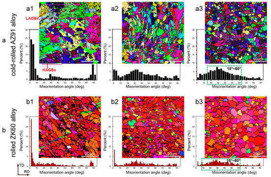 The change of misorientation angle between the grains after the EPT also indicated the recrystallization during the process. The deformed microstructure was dominated by low angle grain boundaries (LAGBs), while the recrystallization grains were represented by large angle grain boundaries (HAGBs) [64]. The grains of cold-rolled AZ31 (Mg-3Al-1Zn) and AZ91 (Mg-9Al-1Zn) alloy were refined after EPT, as shown in Figure 1(a3,a4,b3,b4). Besides, the LAGBs with misorientation within 2–15° were predominant (97%), and the deformed structure with ‘necking’ appeared in the primary grain before recrystallization. After EPT, new fine recrystallized grains formed, with misorientation mainly of HAGBs larger than 15° (82%) [56,65].