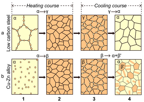 Schematic diagram of phase transition and ultra-fine grains: (a) low-carbon steel [77]; (b) Cu-Zn alloy [79]: (1) nucleation of γ or β phase, (2) grain growth of γ and β phase, (3) formation of α phase nucleation and (4) formation of ultra-fine grains and twin structure of α phase and β′ phase.