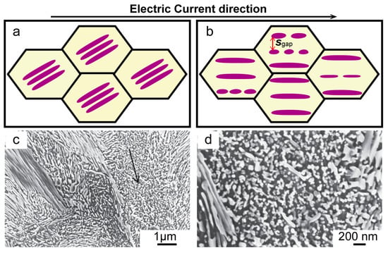 where ρ is the electrical resistivity, L is the total length of the sample, S is the cross-section area and Sgap is the gap area between the fragmented plates, respectively. Further EPT led to the formation of newly-formed cementite plates along the current direction, thus minimizing the free energy of the system. These lamellae are almost parallel to the electric current direction, labelled with an arrow in Figure 4c. The lamellae perpendicular to the electric current direction are easier to transform into grain structures than the parallel ones [94]. The spheroidization process is controlled by the diffusion of carbon atoms from cementite to ferrite. The diffusion process is affected by physical, thermal and electrical heterogeneities.