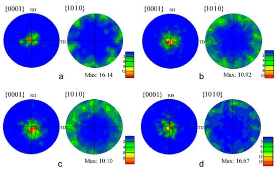 The {0001} and {10} pole figures of the AZ91 alloy after EPT: (a) cold-rolled sample; (b) 100 Hz-EPT; (c) 110 Hz-EPT; (d) 133 Hz-EPT [68].