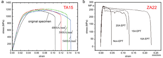 Stress-strain curves of TA15 alloys and ZA22 alloys at different pulse current densities: (a) TA15 [62]; and (b) ZA22 [86].