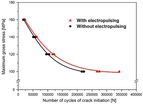 Tang et al. [116] showed that the hardness decreased and fatigue lifetime increased for EPTed SUS316 stainless steel, and the effect of electric current on S-N curve is shown in Figure 8; the results indicated that the fatigue crack initiation was delayed by the application of electric current, which is related to the healing of the fatigue damage, including the recovery of the residual plastic strain and the strain hardening. G. Lesiuk et al. [117] demonstrated a similar effect in AISI 304 steel (0.04% C, 1.1% Mn, 0.41% Si, 0.0437% P, 0.0044% S, 18.16% Cr, 8% Ni, 0.0335% Mo, 0.1% V, 0.32% Cu), and the differences in fatigue lifetimes are much higher with low stress amplitudes than with high stress level.