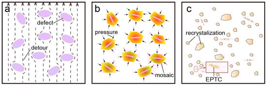 Schematic diagram of defect healing and recrystallization: (a) plastic deformation to form defects and defective areas of the current bypass; (b) the formation of pressure around the metal defects; (c) healing defects, recrystallization and high energy EPT cladding (EPTC) [55,124].
