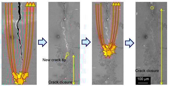 Further study on the crack healing effect in medium carbon steel suggested that the crack was electrically stressed to produce a low-temperature plasma. On the other hand, there was atomic movement towards the crack face, and this motion would be influenced by the local thermal expansion in the vicinity of the crack [126]. The two crack faces merged to achieve crack healing when the thermal expansion was sufficient. In addition, the original microstructure in the area without crack remains unchanged. Thus, the principles of physics during EPT will cause preferential interaction with the defective microstructure during the crack healing process. The healing of fatigue crack by high-density electropulsing in austenitic stainless steel was studied by Hosoi et al. [127,128]. The selective effect was found during crack healing. For the current flowing along the crack because of the electric resistance being higher on the crack surface, the thermal compressive stress was generated along the crack to heal the tip, resulting in the crack tip transferring in the direction of the notch. The position of the current concentration continuously transferred in the direction of the notch. Figure 11 shows the whole process.