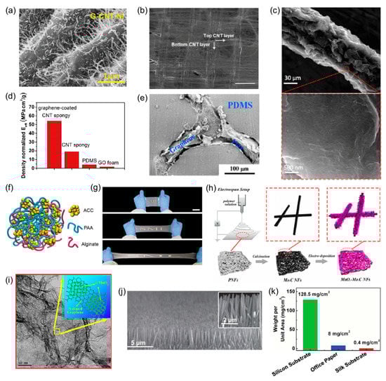 Soft functional materials. (a) Graphene-CNT-nickel hetero-nanostructure. Reprinted with permission from Reference [], Copyright 2017, John Wiley and Sons; (b) Cross-stacked graphene-CNT (carbon nanotube) films. Reprinted from Reference [], Copyright (2017), with permission from Elsevier; (c) SWCNT-based nanowire. Reproduced from Reference [] with permission of The Royal Society of Chemistry; (d) Graphene oxide foam with low-effective elastic modulus for high sensitivity. Reprinted from Reference [], Copyright (2017), with permission from Elsevier; (e) Graphene network embedded in PDMS. Reprinted with permission from Reference [], Copyright 2016 American Chemical Society; (f) Schematic of mineral hydrogel. Reprinted with permission from Reference [], Copyright 2017, John Wiley and Sons; (g) Elongation of 0%, 250%, and 500% of dielectric, liquid metal embedded elastomer. Reprinted with permission from Reference [], Copyright 2016, John Wiley and Sons; (h) Process of developing MnO2-Mo2C nanofiber film. Reprinted with permission from Reference [], Copyright 2016 American Chemical Society; (i) Nitrogen-doped graphene-MnO2 nanosheet composite. Reprinted with permission from Reference [], Copyright 2016 American Chemical Society; (j) Cross-sectional view of aligned NW array. Reprinted with permission from Reference [], Copyright 2016, John Wiley and Sons; (k) Chart indicating silk fibroin as an ultra-lightweight substrate. Reprinted with permission from Reference [], Copyright 2016, John Wiley and Sons.