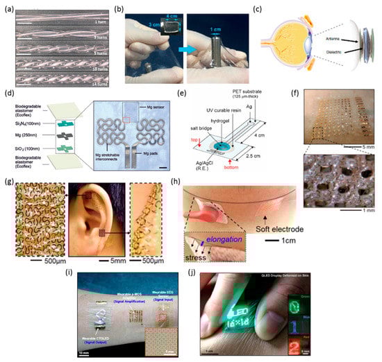 Wearable electronic systems. (a) Microtubule strain sensor and interconnect. Reprinted with permission from Reference []. Copyright 2017, Scientific Reports; (b) Self-healing strain sensor. Reprinted with permission from Reference []. Copyright 2017 American Chemical Society; (c) Wireless glucose and intraocular sensor. Reprinted with permission from Reference []. Copyright 2017, Nature Communications; (d) Biodegradable temperature sensor. Reprinted with permission from Reference [], Copyright 2017, John Wiley and Sons; (e) Schematic illustration of a sweat chloride sensor. Reprinted from Reference [], Copyright (2017), with permission from Elsevier; (f) EOG (electrooculography) electrode mounted on the skin. Reprinted from Reference [], Copyright (2017), with permission from Elsevier; (g) EEG electrodes and interconnects on the auricle area []; (h) Comparison of rigid electrode with associated stress and soft material-enabled skin-like electrode. Reprinted with permission from Reference []. Copyright 2017, Scientific Reports; (i) Skin electrodes with amplifier. Reprinted with permission from Reference []. Copyright 2017 American Chemical Society; (j) QLED (quantum dot light-emitting diode) display on the human skin. Reprinted with permission from Reference [], Copyright 2017, John Wiley and Sons.