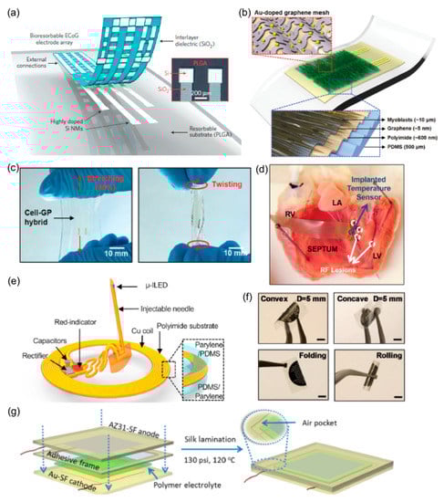 Implantable electronic systems. (a) Bioresorbable ECoG electrodes. Reprinted with permission from Macmillan Publishers Ltd.: Nature Materials []; (b) EMG electrode with Au-doped graphene mesh. Reprinted with permission from Reference [], Copyright 2016, John Wiley and Sons; (c) Stretchability and flexibility of the serpentine-structured electrode in (b). Reprinted with permission from Reference [], Copyright 2016, John Wiley and Sons; (d) Implantable cardiac sensor for monitoring temperature, thermal conductivity, and heat capacity. Reprinted from Reference [], Copyright (2017), with permission from Elsevier; (e) Optogenetic device for wireless light delivery. Reprinted with permission from Reference [], Copyright 2017, John Wiley and Sons; (f) Mechanically flexible, biodegradable microsupercapacitor. Reprinted with permission from Reference []. Copyright 2017, John Wiley and Sons; (g) Multi-layer illustration of a biodegradable battery with silk membrane. Reprinted with permission from Reference []. Copyright 2017 American Chemical Society.