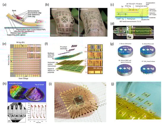 Integration strategies of electronic circuits for FHE. (a) Cross-sectional diagram of a fully-printed OTFT (organic thin-film transistors) device and (b) application of a thin organic film to a human knee. Scale bar, 4 cm. Reprinted with permission from Macmillan Publishers Ltd.: Nature Communications []; (c) Cross-sectional diagram and (d) photograph of an ultra-thin, fully-printed CMOS logic circuit. Scale bar, 500 µm. Reprint is in accordance with the Creative Commons Attribution 4.0 International License []; (e) Optical micrograph of a 12 × 12 tactile sensor array utilizing OTFTs as the switching transistors. Scale bar, 1 cm. The inset shows a magnified view of four pixels. Scale bar, 2 mm. Reprinted with permission from Macmillan Publishers Ltd.: Nature []; (f) Exploded view rendering of the flexible, high-density brain mapping device (left) and respective optical micrographs (right). Reprinted with permission from Macmillan Publishers Ltd.: Nature Communications []; (g) Process flow of XeF2-based Si exfoliation. Reprinted with permission from Reference []. Copyright (2014) American Chemical Society; (h) Flexible CMOS circuits formed by controlled spalling (top). Cross-section TEM image of the flexible circuit, stressor and handle layers (bottom left). Resulting voltage waveform of a 100 stage ring oscillator (bottom right). Reprint is in accordance with the Creative Commons Attribution 3.0 International License []; (i) Integration of a thinned die in a flexible substrate. Reprinted from Reference [], Copyright (2015), with permission from Elsevier; (j) Scaled production of soft-adhesive electronics with surface mount chip components. Reprinted with permission from Reference [], Copyright 2017, John Wiley and Sons.