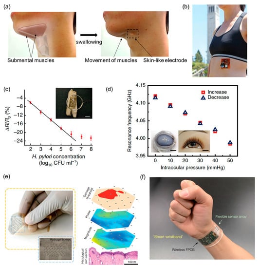 Health monitoring and disease diagnostic systems. (a) Illustration of targeted submental muscles on the chin and photos capturing the movement of the muscles upon swallowing activity. Reprinted with permission from [], Copyright 2017, Scientific Reports; (b) Photographs of the wearable sensor patch mounted on a person’s lower left rib cage (left) and the component side of the patch (right). Reproduced from [], Copyright 2016, John Wiley and Sons; (c) Percentage change in graphene resistance versus concentration of H. pylori cells with optical image of the graphene wireless sensor biotransferred onto the surface of a tooth (inset optical image). Reproduced from [], Copyright 2012, Macmillan Publishers Ltd.: Nature Communications; (d) An inkjet printed array, showing the hexagonal configuration of 55 equally spaced gold electrodes; inset shows printed hydrogel bumps on the fabricated array (left). Schematic representation of the device operation for early detection of pressure ulcers (right). Reproduced from [], Copyright 2015, Macmillan Publishers Ltd.: Nature Communications; (e) Frequency response of the sensor during a pressure cycle for ocular diagnostics. Inset shows photographs of the sensor transferred onto the contact lens worn by a bovine eyeball (left) and a mannequin eye (right). Scale bar, 1 cm. Reproduced from [], Copyright 2017, Macmillan Publishers Ltd.: Nature Communications; (f) Photograph of a wearable flexible integrated sensing array on a subject’s writs, integrating the multiplexed sweat sensor array and the wireless flexible printed circuit board (left). Simultaneous system-level measurements (right). Reproduced from [], Copyright 2016, Macmillan Publishers Ltd.: Nature.