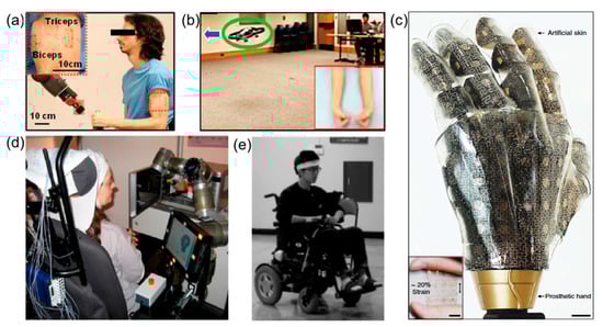 Figure 6c presents a “smart” prosthetic hand [] with artificial skin and embedded soft sensors, enabled by stretchable silicon nanoribbon on a silicone elastomer (PDMS). A high performance, single crystalline silicon designed a highly sensitive device with strain, pressure, and temperature sensors. The electronic skin on the prosthetic hand with the soft sensor package demonstrated capabilities of hand shaking, keyboard typing, ball grasping, and feeling surface temperature in daily lives. Another wearable set of FHE embedded in a headset [] with EEG electrodes demonstrated the feasibility of hybrid brain-controlled computer (Figure 6d). In this study, the wearable head set recorded steady-state visually evoked potentials to control a computer interface, which can be directly usable for severely disabled people who cannot use their arms and hands. The event-related synchronization of EEG can be used in many applications such as text spelling interface, computer control, wheelchair control, and more. Among those, hands-free control of an electronic wheelchair has gained a great interest in rehabilitation and aging societies. Patients with Parkinson’s disease or amyotrophic lateral sclerosis experience paralyzed voluntary muscles and significantly reduced motor strength. In addition to the EEG-base method, eye movement can be utilized to control a wheelchair. A wearable FHE shown in Figure 6e [] enables a non-invasive, comfortable arrangements to measure eye movements via EOG recording. In this work, the wearable system included forehead EOG electrodes on a headband along with Bluetooth-based wireless telemetry. A subject wearing the electrode system successfully drove a power wheelchair through an 8-shaped driving course without collision with obstacles. Collectively, soft, lightweight materials play a key role to design wearable, comfortable FHE. The mechanical compliance of the soft sensors makes conformal and intimate contact to the skin for high-fidelity recording of non-invasive biopotentials for various HMI applications.