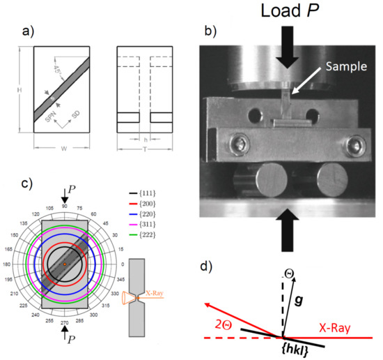The testing device with the installed SCS was mounted on top of a six-axis goniometer, which enables the exact placement of the sample with respect to the incoming synchrotron beam. The focused beam with a cross section of 8 µm × 20 µm was directed to the center of the thin gauge section, thus penetrating approximately 30 billion grains. The high energy X-ray radiation had a wavelength of λ = 0.0178 nm. To avoid shadowing of the scattering cones by the edges of the gauge slits, a trapezoid slit profile was used. The diffracted signal was recorded on a 2D-area detector (mar CCD), capable of recording one scan every seven seconds. The detector–sample distance was set to capture the first five Bragg reflections (Debye–Scherrer rings), so enabling a reasonable compromise between recording sufficiently high diffraction orders while still maintaining a good angular resolution. For data analysis, the 2D scans were averaged over 2°-wide polar segments to give 180 radial line scans, which were then fitted by split-Pearson-VII functions to obtain peak parameters such as the 2θ peak position, the integral intensity, and the integral peak width. For more details related to data reduction, see recent work by Lohmiller et al. [11]. Because of the short wave length of the high energy synchrotron beam, the only grains that are diffracting are those that have the diffracting vector g (lattice plane normal) almost normal to the incoming beam direction (deviation Θ = arcsin (λ/2d(hkl)): (111): 2.27°, (200): 2.62°, (220): 3.64°, with the Bragg angle Θ and lattice plane spacing d(hkl)), Figure 1c. It should also be mentioned that high monochromacy of the synchrotron radiation strongly reduces the fraction of grains in the Bragg condition. Thus, because of the high transmission, synchrotron radiation is an appropriate way to reach high grain statistics to a level reliable for measurements of weak textures, which is very important in the present texture analysis. Note that not all of the crystallographic texture was measured in the experiments because the sample was not rotated. Thus, since the specimen was not rotated, only low scattering angles of the diffraction circles were available, and this allowed for the determination of the peripheral parts of the pole figures only.