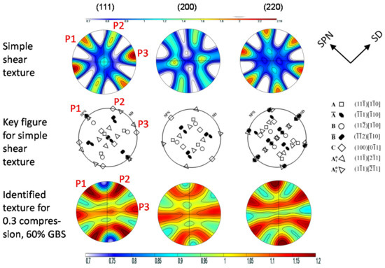 Pole figures simulated for simple shear and 60% grain boundary sliding (GBS) with C = 0.3. Maxima at the periphery evaluated are marked with P1, P2, and P3. The main texture components of simple shear deformed fcc metals (denoted by {hkl} parallel to the shear plane and <uvw> parallel to the shear direction) are given in the key figure.