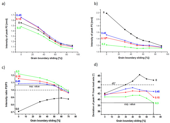 Dependence of the peak intensities P2 (a) and P3 (b), intensity ratio P2/P3 (c), and angular deviation of Peak P1 from the load axis (d) on the contribution of GBS to strain with the fraction of compressive strain as parameter. In (c,d), the amount of GBS is estimated from the experimentally measured parameters.