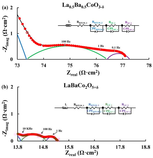 Figure 2 depicts typical Nyquist plots obtained for symmetric cells of the A-site cation disordered La0.5Ba0.5CoO3−δ and A-site cation ordered LaBaCo2O5+δ materials in moist synthetic air at 500 °C. Both A-site cation disordered and ordered materials present similar Nyquist plots for all temperatures as illustrated in Figure 2. Two main contributions coming from the electrolyte and the electrode are observed. The equivalent circuit model used to fit the data is LR (RQ)(RQ)(RQ), where L, R and Q are inductance, resistance and constant phase element respectively. The resistor (RBZY10_1) and the first RQ element (RBZY10_2 and CPEBZY10_2, blue semicircle) are assigned to the electrolyte of the symmetric cells. The two other RQ elements (i.e., RSP_1, CPESP_1, RSP_2, CPESP_2, green and violet semicircles respectively for La0.5Ba0.5CoO3−δ) correspond to the electrode response of the cells. The assignment of these electrochemical processes was carried out by evaluating the pseudocapacitance of the RQ elements (Table S1 for both La0.5Ba0.5CoO3−δ and LaBaCo2O5+δ) obtained with the electrochemical model: i.e., La0.5Ba0.5CoO3−δ; ~10−10 F/cm2 for the first RQ element, assigned as the response of the electrolyte [8,9,10,35,36,37,38,39,40,41]; ~10−4 F/cm2 and 10−2 F/cm2 for the other two RQ elements, assigned as the response of the electrode [8,9,10,35,36,37,38,39,40,41].