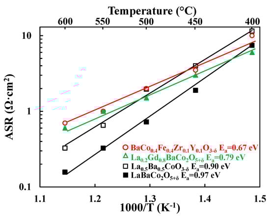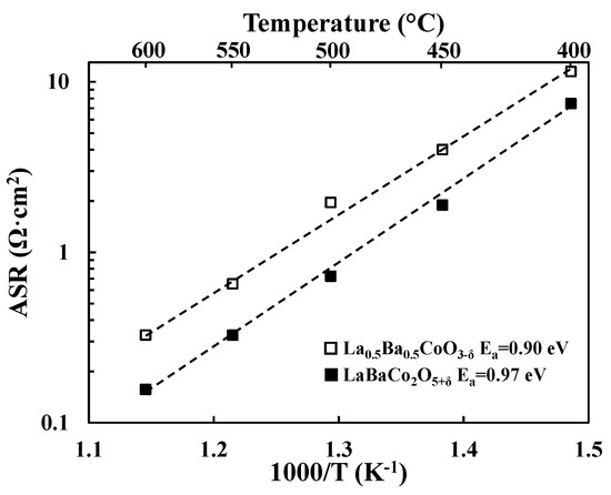Measurements in low pO2 conditions have been proposed in order to eliminate the presence of oxide-ions and isolate the proton conduction contribution when examining prospective PCFC cathodes [16]. As shown in Figure 5, a decrease in ASR and Ea for both LaBaCo2O5+δ and La0.5Ba0.5CoO3−δ is observed in humidified inert atmosphere (pO2 = 10−4 atm). This decrease may suggest the presence of proton conductivity in the material, and is similar to what was observed for LGBC by Strandbakke et al. [16].