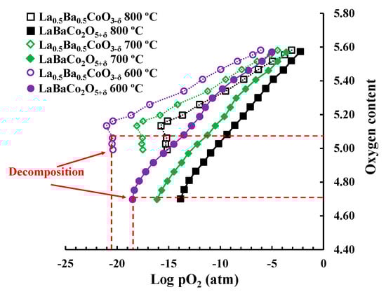 Coulometric titration for La0.5Ba0.5CoO3−δ and LaBaCo2O5+δ at 600, 700 and 800 °C. The red dotted lines show the decomposition of both materials at the indicated oxygen content and pO2 at 600 °C.