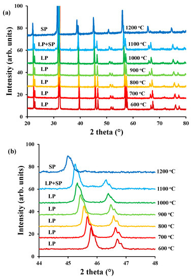 (a) High temperature X-Ray diffractogram for LaBaCo2O5+δ between 600–1200 °C and 20–80° in air; (b) Inset between 44–48° the transformation from LaBaCo2O5+δ (LP) to La0.5Ba0.5CoO3−δ (SP) is observed by the disappearance of the peak splitting.