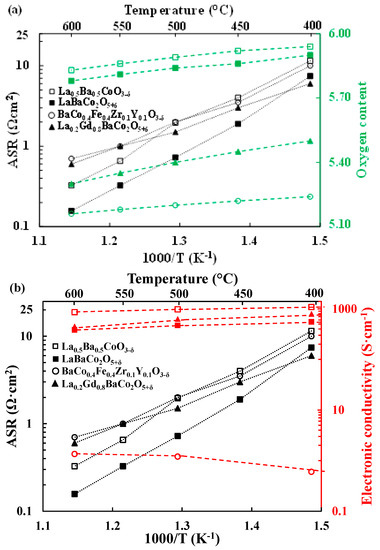 The ASR and the oxygen content as a function of temperature for both La0.5Ba0.5CoO3−δ and LaBaCo2O5+δ materials are shown in Figure 10a. Likewise, the ASR and the electrical conductivity vs. temperature are plotted in Figure 10b. Data for the single perovskite BCFZY [3,13] and the layered double perovskite LGBC [16,45] materials extracted from the literature are added for comparison. Two observations are evident from these two figures: (1) a lower oxygen deficiency of La0.5Ba0.5CoO3−δ and LaBaCo2O5+δ compared to BCFZY and LGBC; (2) a significantly lower (nearly two orders of magnitude) electrical conductivity for BCFZY.