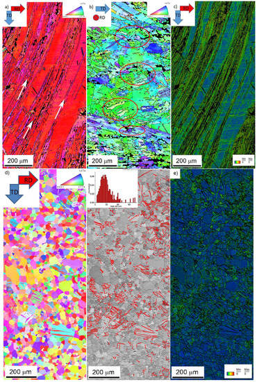 Orientation image maps (OIM) of the as-rolled: (a) surface (600 × 1300 µm)—the white arrows indicate the fine-grained strips; (b) cross-section (600 × 1300 µm); and (c) the corresponding Kernel Average Misorientation map (KAM) for the surface; (d) OIM map of the surface of the heat-treated specimen (550 × 1400 µm). On the corresponding image quality map, the extension twin boundaries (marked in red color) and the grains size distribution are indicated; (e) KAM map for the surface of the heat-treated specimen. The KAMs were calculated as the average misorientation between the data point and all of its first neighbors while excluding misorientations higher than 5°.