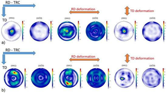In the as-rolled state, the initial texture is similar to that observed for AZ31 sheets in the H24 temper condition (strain hardened and partially annealed) [1,24,25,26]. However, in our samples, peak intensity splitting of the (0001) pole toward both RD and TD occurs with a more pronounced deviation in TD (Figure 3).