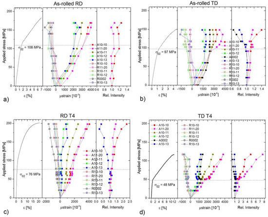 Stress–strain curves and dependences of the lattice strains and integral intensities of particular diffraction peaks in an axial and radial detector on the applied stress for as-rolled specimens tensioned in: (a) RD; and (b) TD directions; and heat treated (T4) specimens tensioned in: (c) RD; and (d) TD directions. The dash lines indicate the yield stress for the particular specimens.