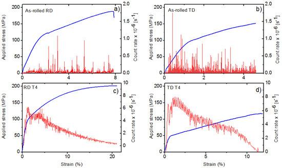 The tensile deformation curves for both specimen conditions are shown in Figure 4. The yield strength is higher for the as-rolled specimens. This parameter is further influenced by the loading direction; in RD direction higher values were measured. The heat treatment enhances the elongation; it is almost six times higher after T4. The strain developments of the AE count rate (number of the crossing of the threshold level per second), measured during diffraction test, are shown in Figure 5. Several interesting features can be recognized on the AE curve. Firstly, AE appears at the very beginning of loading while the deformation is still macroscopically elastic. Secondly, the AE response is higher for TD specimens. Thirdly, the AE response of the heat-treated sample is approximately two orders higher near the yield stress. As shown by Friesel and Carpenter, there are two primary AE sources in magnesium alloys—dislocation slip and twinning [18]. In the case of dislocations, the AE signal is emitted by highly correlated motion of many dislocations. These so-called dislocation avalanches emerge as simultaneous breakaways of dislocations pinned at different obstacles (grain boundaries, solute atoms, precipitates, forest dislocations, etc.). Recent studies (e.g., [19]) indicate that this can take place already at low stresses, giving rise to localized micro-plasticity. Since the dislocation slip is simultaneously active in many grains, and the amplitude of the signal is rather low [20], the resultant dislocation AE signal is usually of a continuous noise-like type. In contrast, in the case of twinning, the AE detect the nucleation and propagation (i.e., growth of twin in length) stage of the mechanisms, which is an abrupt motion of strongly correlated twinning dislocations. Thus, the twinning emits burst signals. The amplitude of the transient AE twinning signal is directly proportional to the length of the twin [21]. In general, the AE events originated from twinning usually have higher amplitudes and power than those of the dislocation origin. As it was shown by several works [9,22,23], in magnesium alloys the peak around the yield point is connected with the synergic activity of non-basal dislocation slip and twinning. Our present results indicate that the twinning activity is higher in TD direction, particularly for the heat-treated specimen.